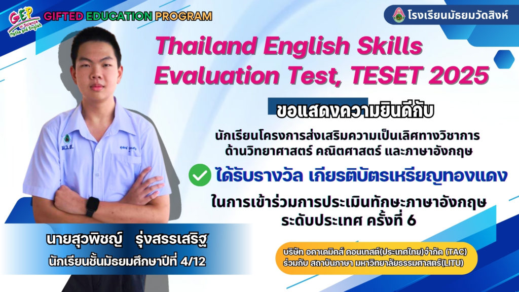 ขอแสดงความยินดีกับ นักเรียนโครงการส่งเสริมความเป็นเลิศทางวิชาการ ด้านวิทยาศาสตร์ คณิตศาสตร์ และภาษาอังกฤษ