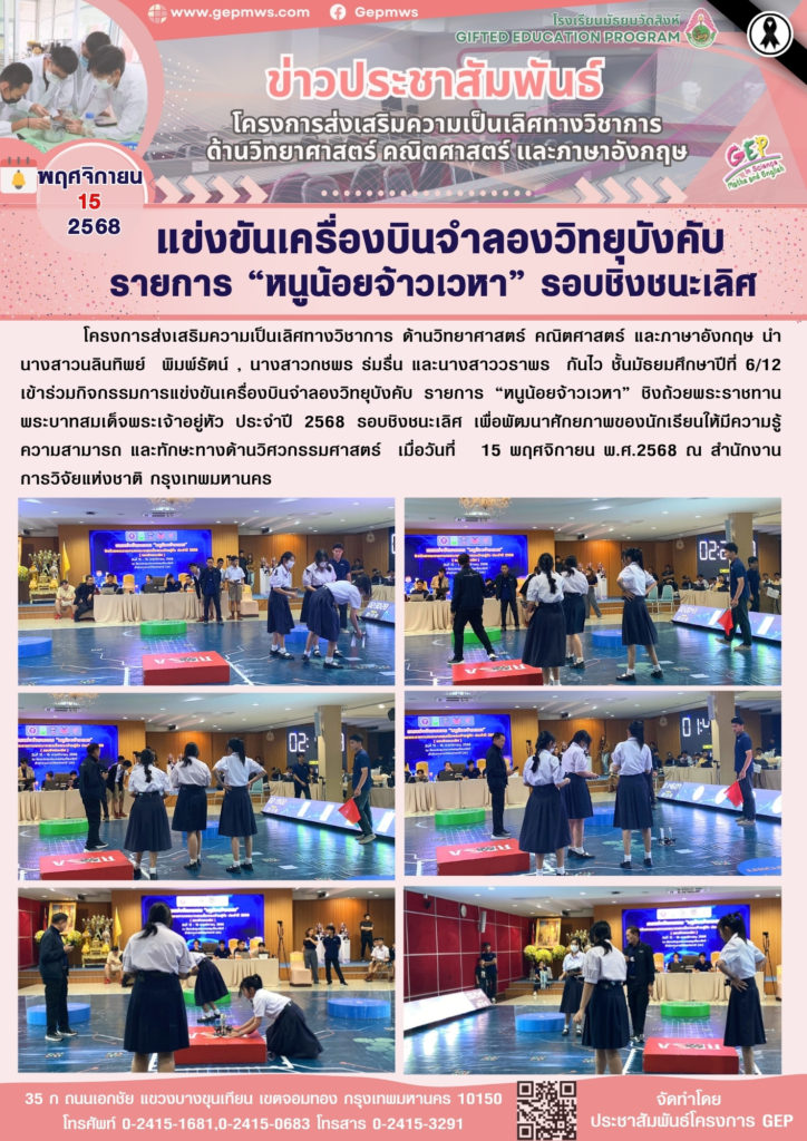 โครงการส่งเสริมความเป็นเลิศทางวิชาการ ด้านวิทยาศาสตร์ คณิตศาสตร์ และภาษาอังกฤษ นำ นางสาวนลินทิพย์ พิมพ์รัตน์ , นางสาวกชพร ร่มรื่น และนางสาววราพร กันไว ชั้นมัธยมศึกษาปีที่ 6/12 เข้าร่วมกิจกรรมการแข่งขันเครื่องบินจำลองวิทยุบังคับ รายการ “หนูน้อยจ้าวเวหา” ชิงถ้วยพระราชทานพระบาทสมเด็จพระเจ้าอยู่หัว ประจำปี 2568 รอบชิงชนะเลิศ เพื่อพัฒนาศักยภาพของนักเรียนให้มีความรู้ ความสามารถ และทักษะทางด้านวิศวกรรมศาสตร์ เมื่อวันที่ 15 พฤศจิกายน พ.ศ.2568 ณ สำนักงานการวิจัยแห่งชาติ กรุงเทพมหานคร