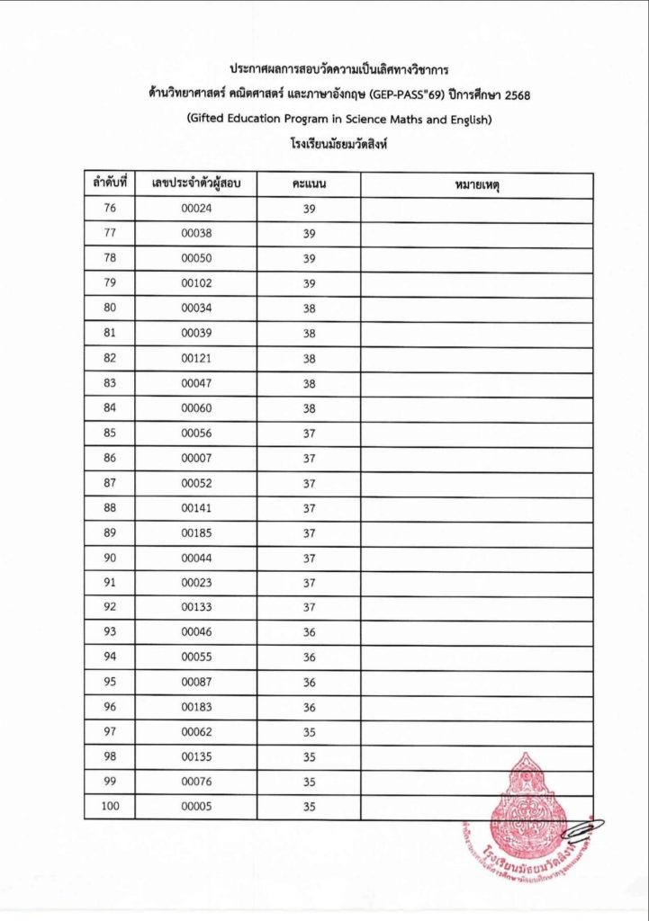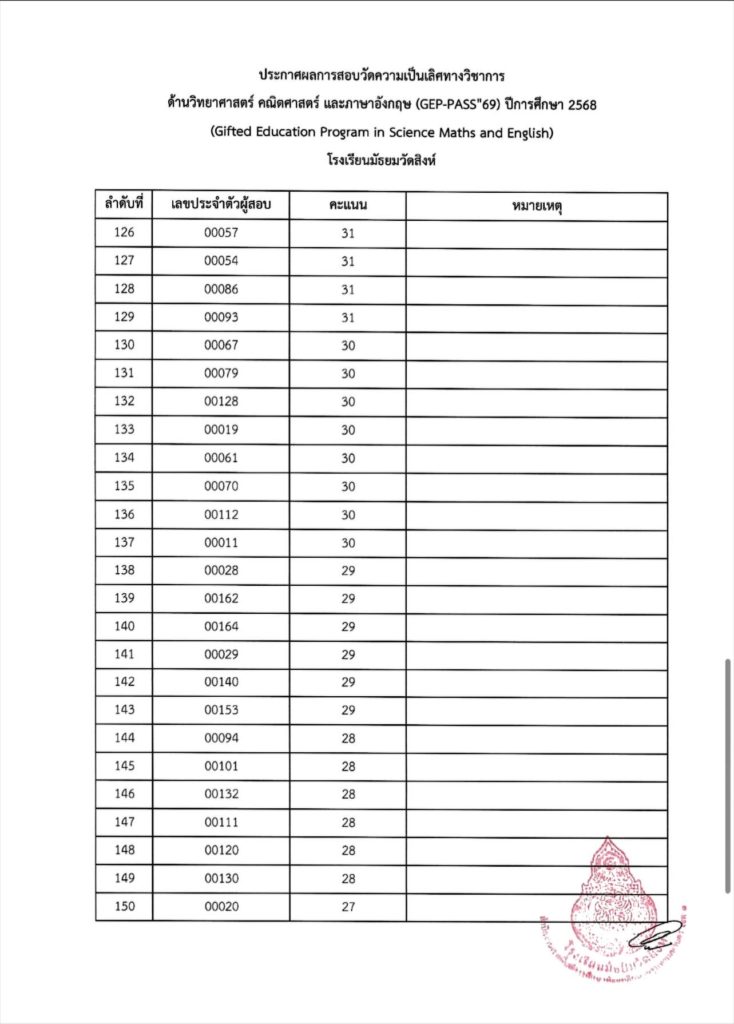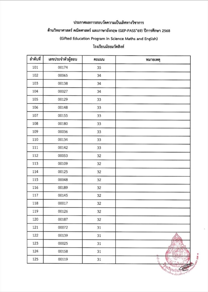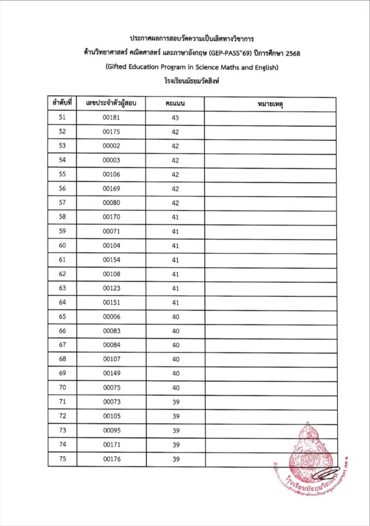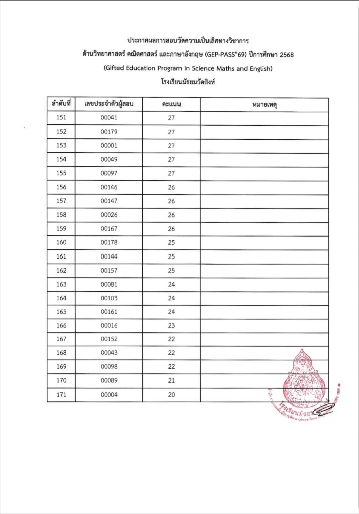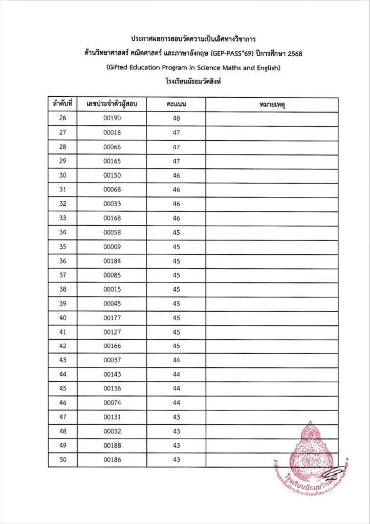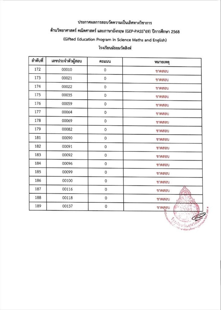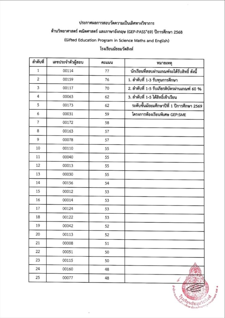 ประกาศผลการสอบวัดความเป็นเลิศทางวิชาการด้านวิทยาศาสตร์ คณิตศาสตร์ และภาษาอังกฤษ (GEP-PASS’69) ปีการศึกษา 2568