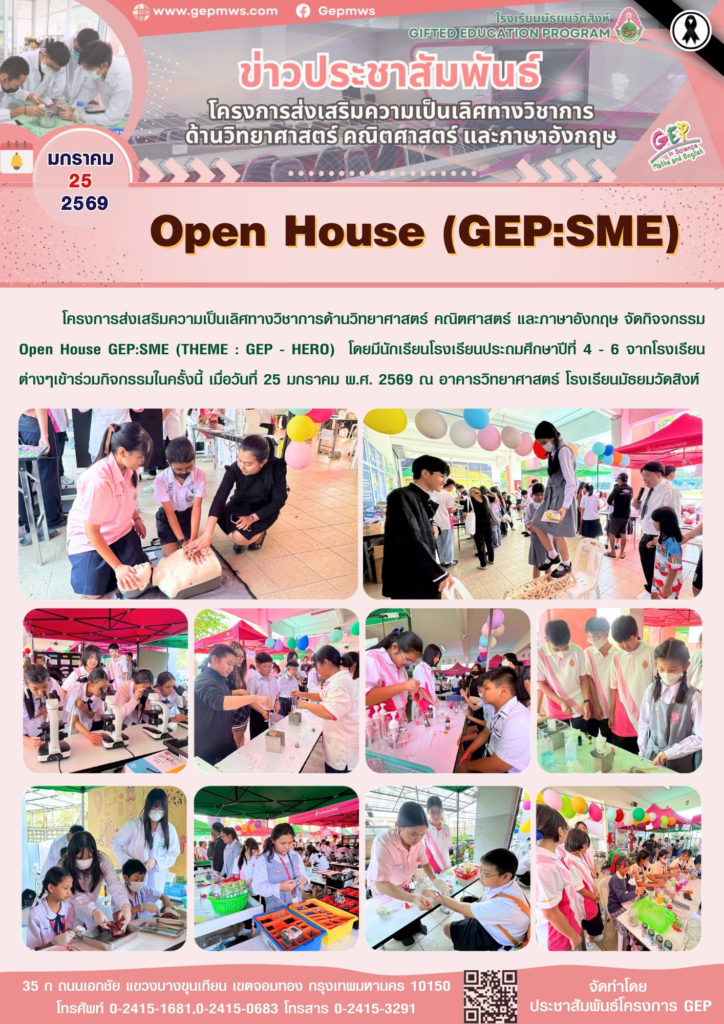 โครงการส่งเสริมความเป็นเลิศทางวิชาการด้านวิทยาศาสตร์ คณิตศาสตร์ และภาษาอังกฤษ จัดกิจจกรรม Open House GEP:SME (THEME : GEP – HERO) โดยมีนักเรียนโรงเรียนประถมศึกษาปีที่ 4 – 6 จากโรงเรียนต่างๆเข้าร่วมกิจกรรมในครั้งนี้ เมื่อวันที่ 25 มกราคม พ.ศ. 2569 ณ อาคารวิทยาศาสตร์ โรงเรียนมัธยมวัดสิงห์