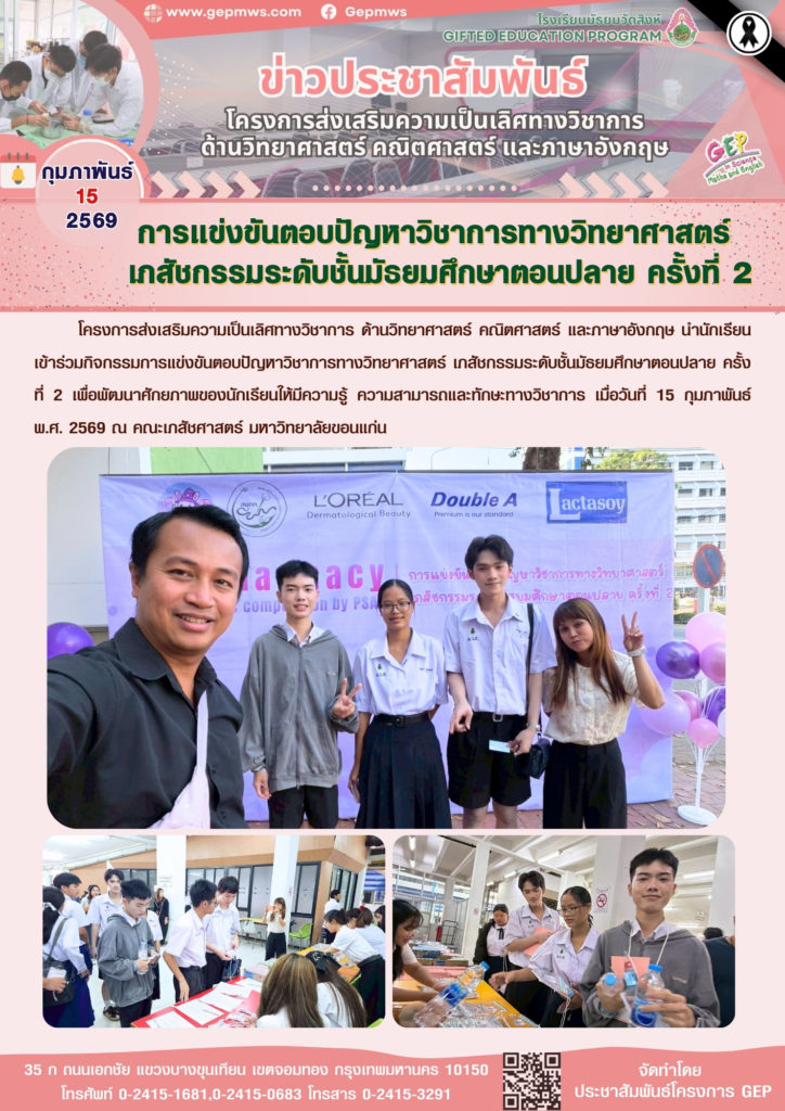 โครงการส่งเสริมความเป็นเลิศทางวิชาการ ด้านวิทยาศาสตร์ คณิตศาสตร์ และภาษาอังกฤษ นำนักเรียนเข้าร่วมกิจกรรมการแข่งขันตอบปัญหาวิชาการทางวิทยาศาสตร์ เภสัชกรรมระดับชั้นมัธยมศึกษาตอนปลาย ครั้งที่ 2 เพื่อพัฒนาศักยภาพของนักเรียนให้มีความรู้ ความสามารถและทักษะทางวิชาการ เมื่อวันที่ 15 กุมภาพันธ์ พ.ศ. 2569 ณ คณะเภสัชศาสตร์ มหาวิทยาลัยขอนแก่น