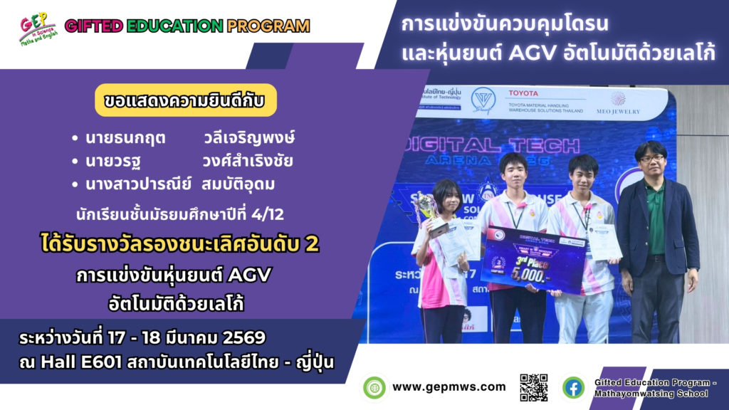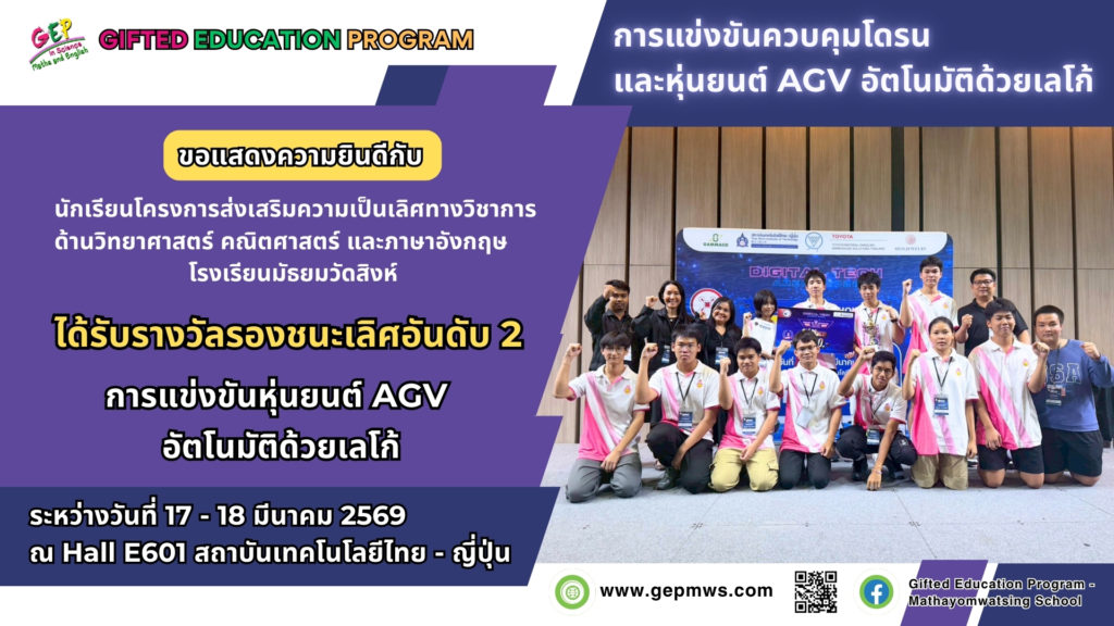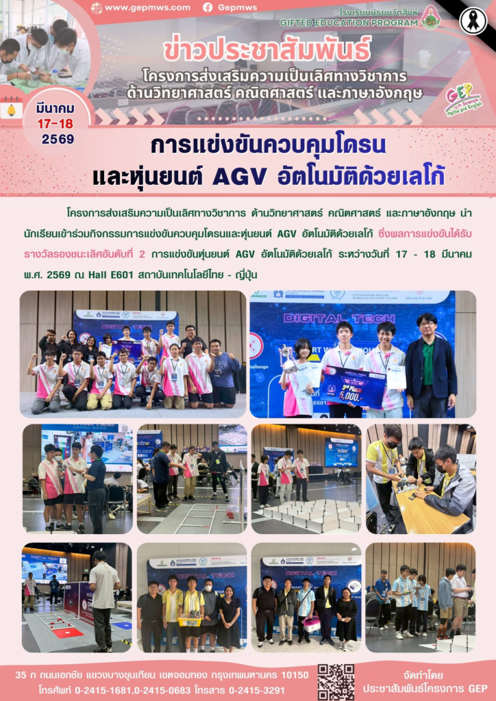 โครงการส่งเสริมความเป็นเลิศทางวิชาการ ด้านวิทยาศาสตร์ คณิตศาสตร์ และภาษาอังกฤษ นำนักเรียนเข้าร่วมกิจกรรมการแข่งขันควบคุมโดรนและหุ่นยนต์ AGV อัตโนมัติด้วยเลโก้ ซึ่งผลการแข่งขันได้รับรางวัลรองชนะเลิศอันดับที่ 2 การแข่งขันหุ่นยนต์ AGV อัตโนมัติด้วยเลโก้ ระหว่างวันที่ 17 – 18 มีนาคม พ.ศ. 2569 ณ Hall E601 สถาบันเทคโนโลยีไทย – ญี่ปุ่น